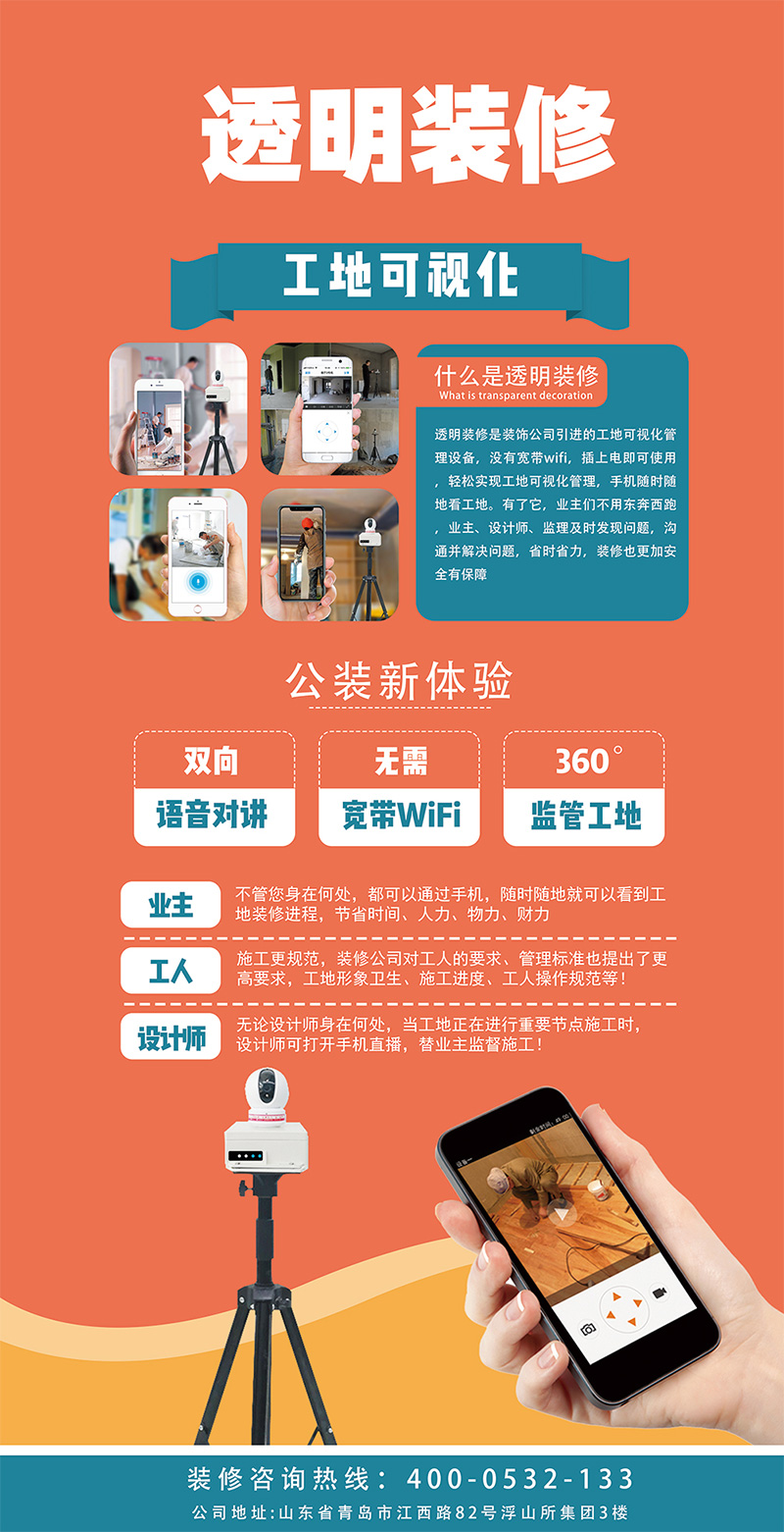 目前消费者对装修公司的各种担心,公司率先将“透明装修·工地可视化”引进公司,并且成为我市率先推出“智能透明装修·随时随地手机看工地进程·装修更放心”的公司。