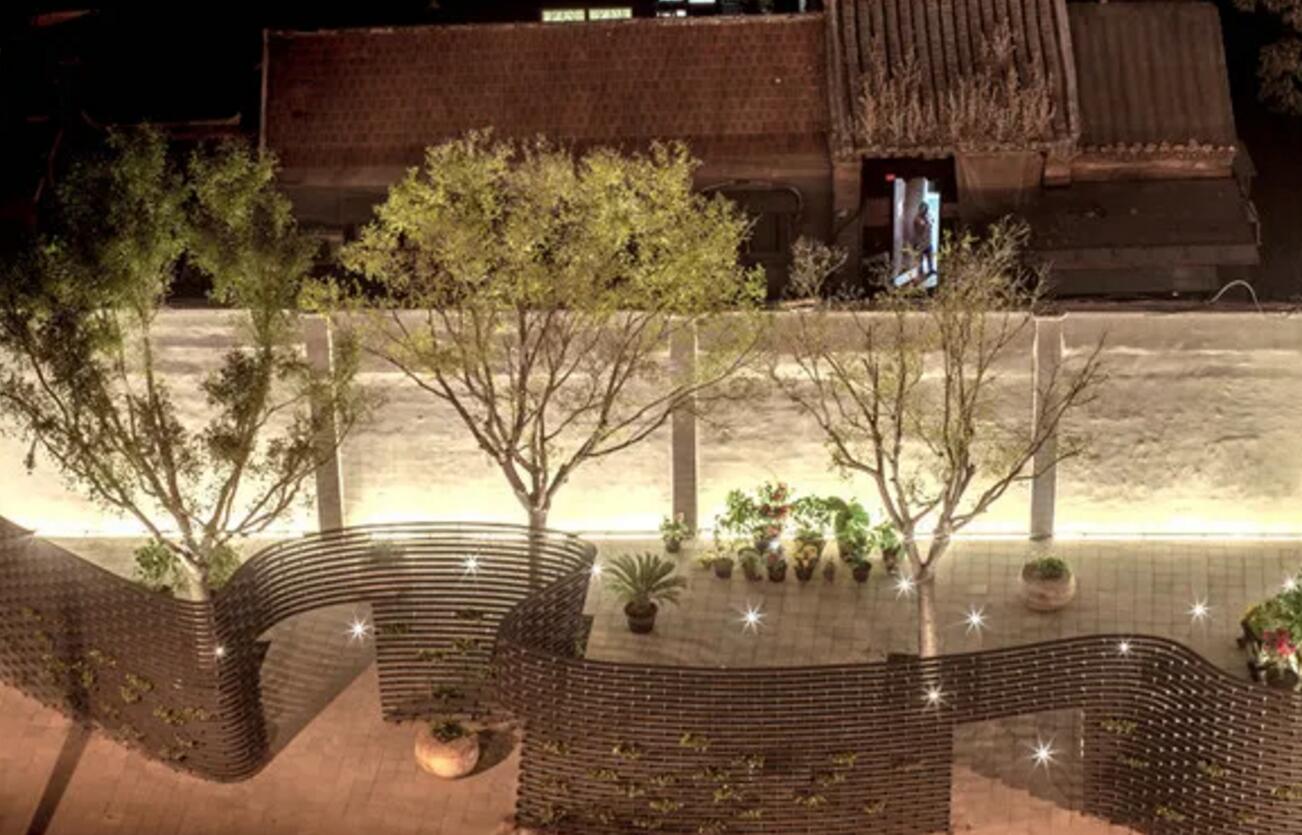 所谓“墙上痕”,就是将北京传统建筑中的砖墙作为图像提取的对象,将砖墙构造进行反转,得到了砖缝的“负”形。设计师在距离较小的位置,采用了平直的处理,与两侧实体墙相连接。在距离较大的位置,采用了曲面的设计,使路过者能有更多角度进行观赏。而在较远的地方观察或者直视时,通透性非常好,视线可以直抵后面的老墙体,呈现消失的感觉。